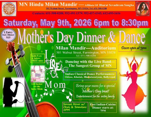 Bring your mom for a treat at Milan Mandir Mother's Day Dinner and Dance on Saturday, May 9th 5pm to 8:30pm. See flyer for more details.