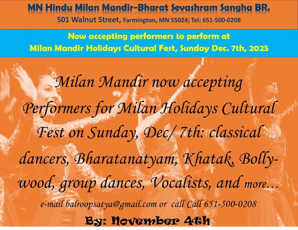 Would you like to perform at Milan Holidays cultural Fest on Sunday, December 7th, Please text or call 651-500-0208. Group dances, group vocalists are all welcome! call today