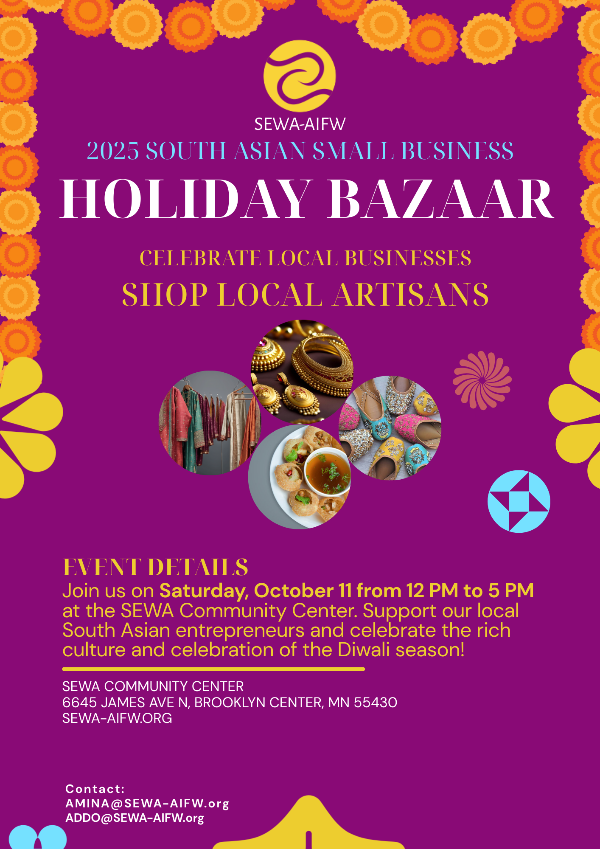 We are excited to announce that we will be hosting our 2025 South Asian Small Business Holiday Bazaar this October 11th at the SEWA-AIFW community center (6645 James Ave N, Brooklyn Center, MN 55430). Come support local businesses and artisans from 12PM to 5PM and celebrate our rich culture together as we prepare for Diwali.