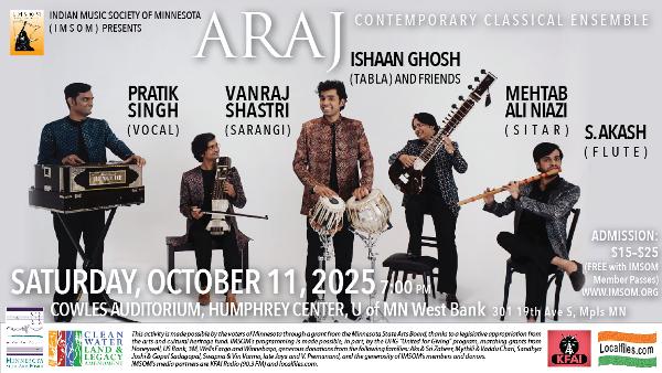 The Fall 2025 season concludes with a special concert event: the contemporary classical ensemble Araj. This performance spotlights some of the most promising young musical artists from India, featuring: