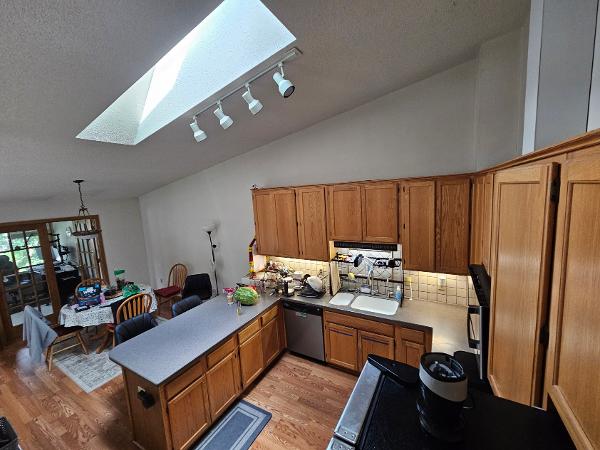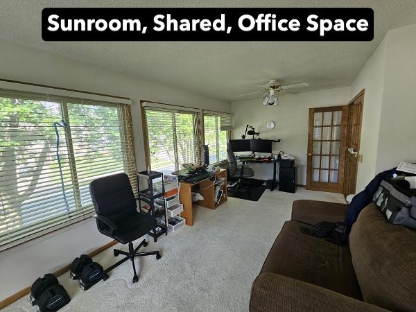 You'll share the kitchen, bathroom, and living spaces. The home is bright and airy with skylights and a cozy sunroom.