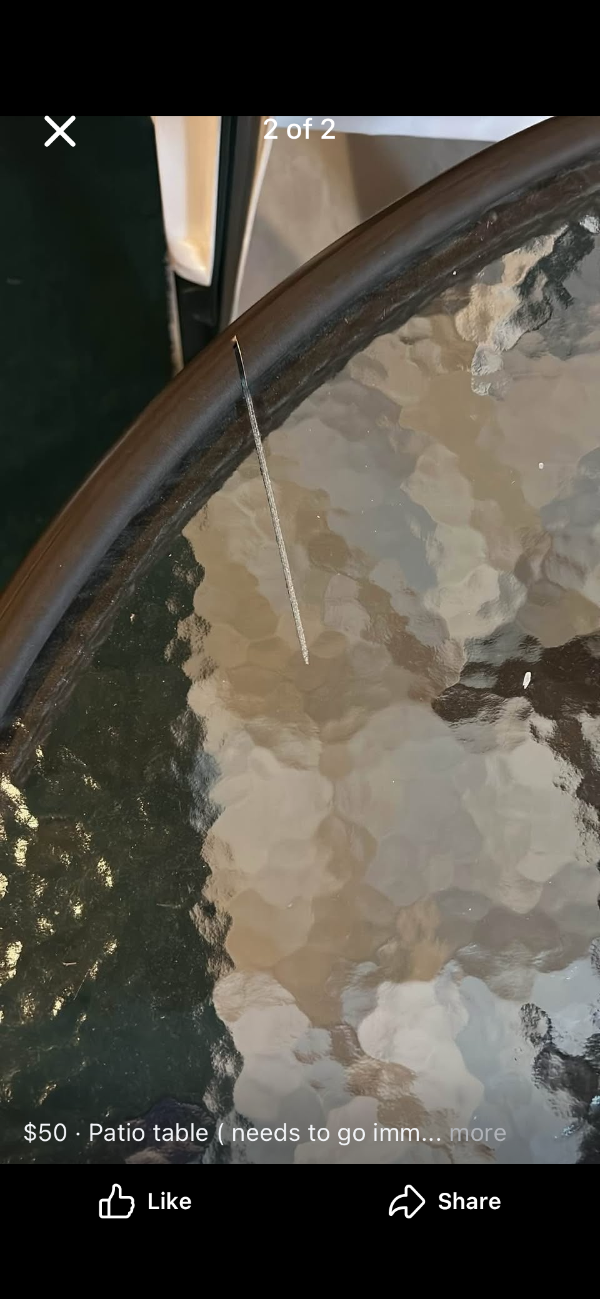 An oval shaped patio table .metal frame glass top and sa small cut on the top , While moving homes . 50 inch Lx42 inch wide x 27 inch height